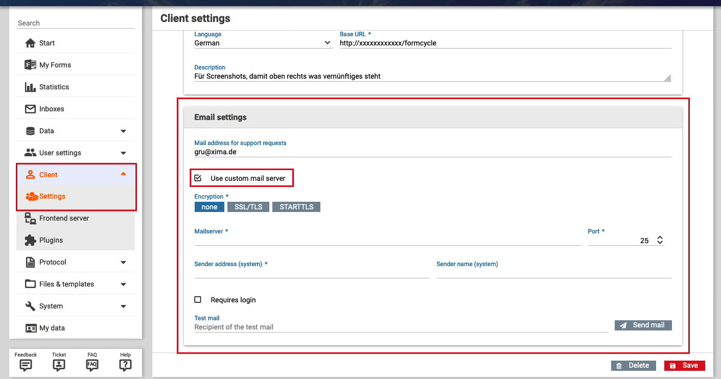 Change to Client   Settings in the navigation tree and select the option "Use custom mail server" in the section "E-mail settings".