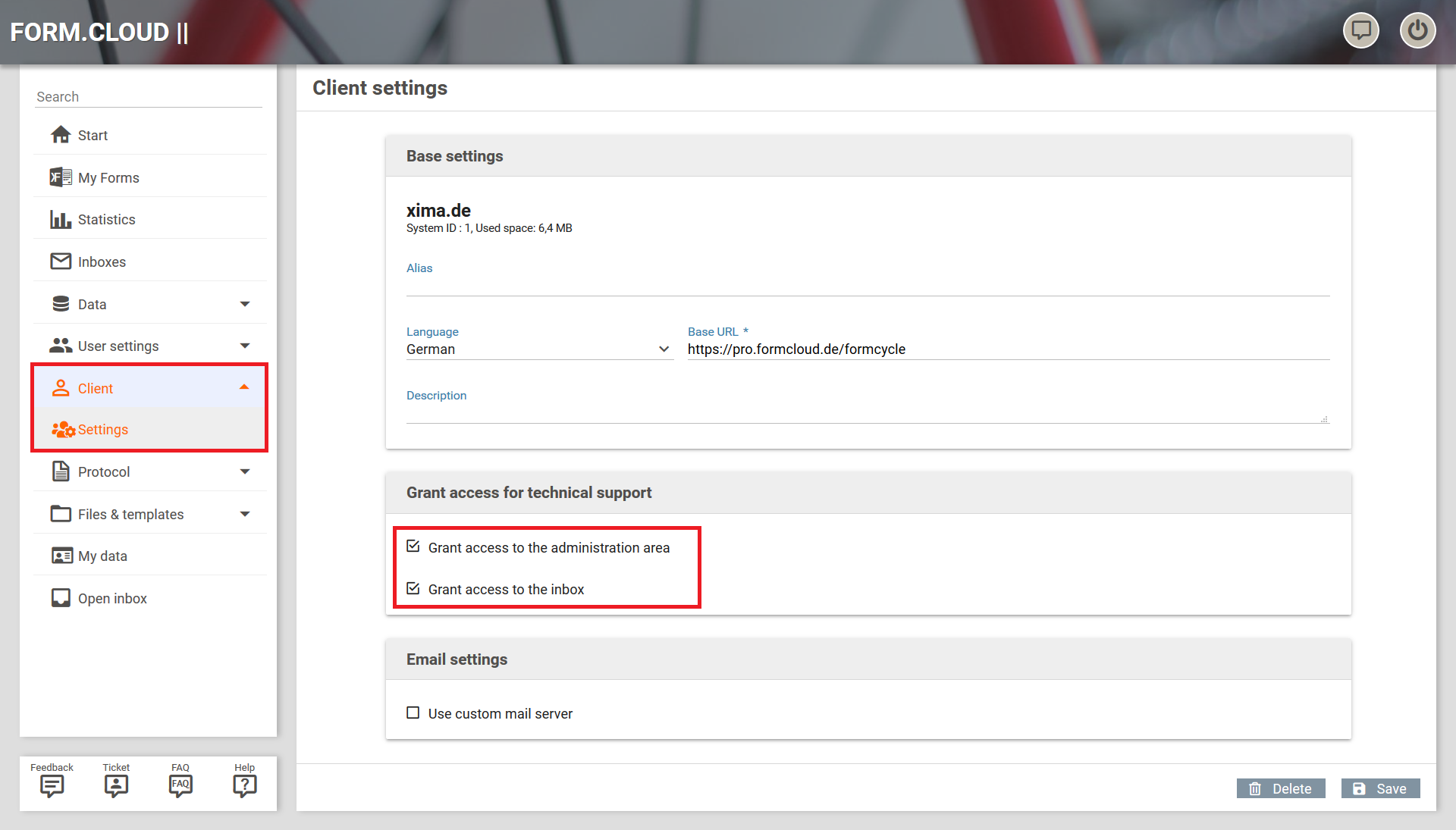 • The option "Grant access to the administration area" allows the support to view and change all settings! Accessing the data of the inbox is not possible with this option.