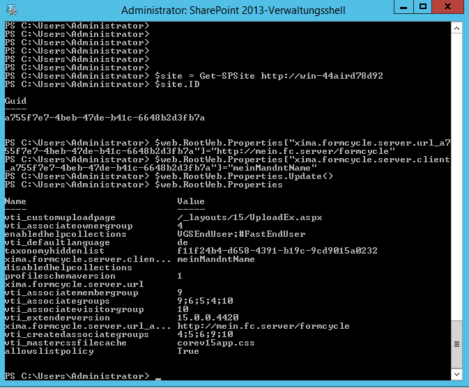 Example: $site.RootWeb.Properties["xima.formcycle.server.client_a755f7e7-4beb-47de-b41c-6648b2d3fb7a"]="demoMandant" - Update the settings: $site.RootWeb.Properties.Update()