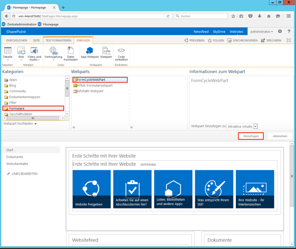 The plugin has now been added to the document and allows for Xima® Formcycle forms to be integrated into SharePoint.