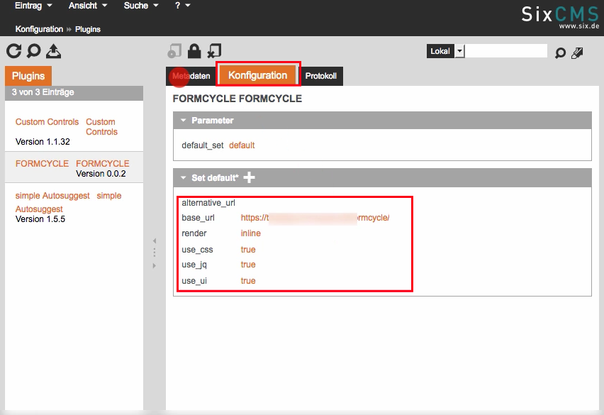 Hier muss die URL zum FORMCYCLE Server hinterlegt werden. Es ist zu beachten, dass der SixCMS Server Zugriff auf den FORMCYCLE Server über die angegebene base_url hat!