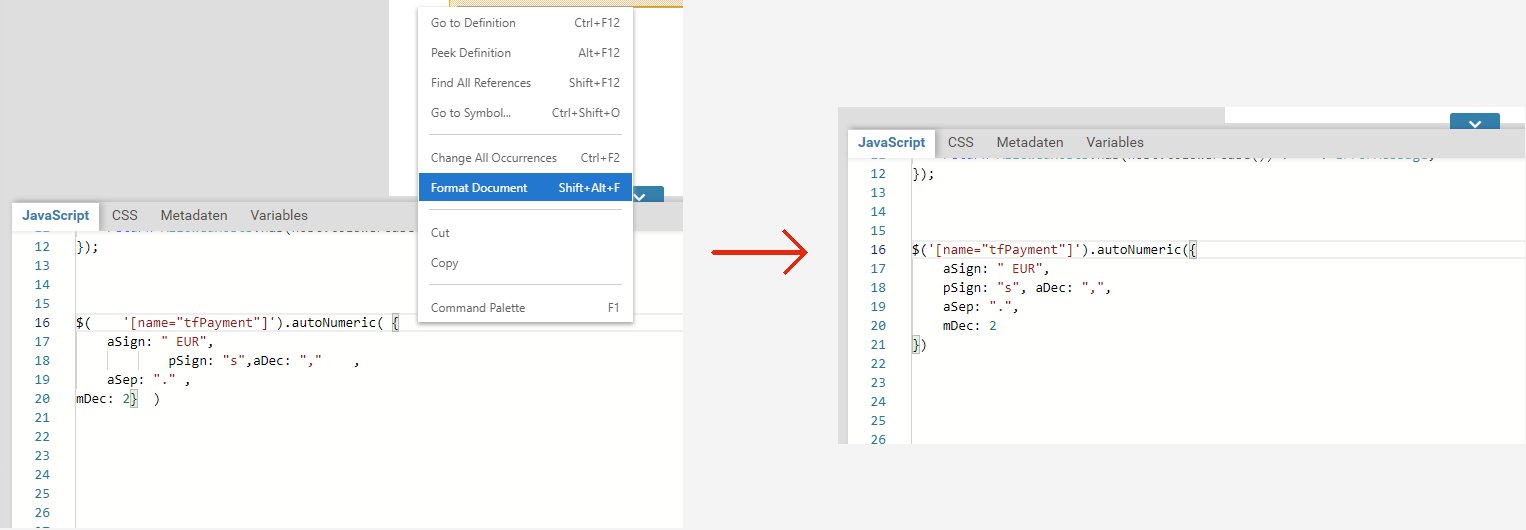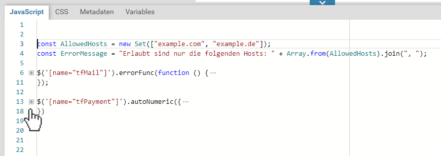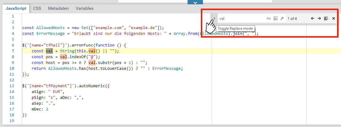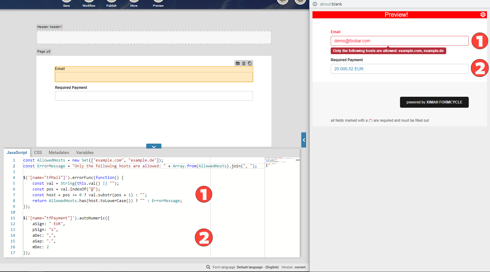Create your own business logic in the JavaScript tab. The figure shows an email input field. It only allows valid email addresses. A JavaScript function is added that adds an additional check and only allows email addresses of certain hosts. Another JavaScript function changes the number format of an input field for a currency: always show the current sign (EUR) and exactly two decimal digits.
