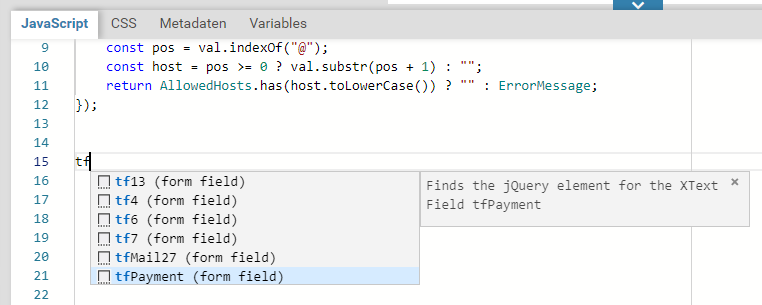 The autocomplete features makes it easier and faster to select form fields. As you type, you get a list of suggestions with matching form fields. When you select a suggestion and press Enter, a jQuery selector for that form field is inserted automatically. So when you type tfMail and press enter, you get $("[name='tfMail']").