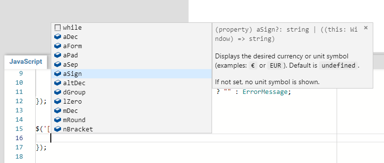 Autcomplete also works with function calls and objects. The user needs to enter the required payment in a text field. To help the user, we would like to show the currency sign (such as EUR) in the text field as well. We already wrote the following code in the JavaScript tab: $("[name='tfPayment']").autoNumeric({}). Our cursor is now between the two curly braces ({}). Here we have to enter the options that we would like to pass to the JavaScript library autoNumeric. So we press ctrl + space to trigger the autocompletion feature. The editor recognizes that we are calling the method autoNumeric on a jQuery object, and presents us with a list of possible options. We navigate to aSign and are told that this is indeed the right option to set the currency. Finally we press enter to accept the suggestion and give it the currency sign we want.