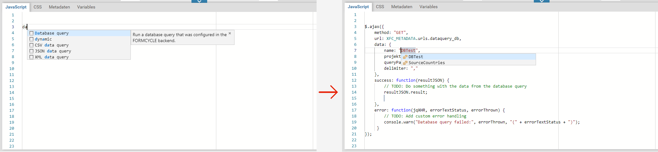 Code snippets are small, independent parts of a programm that can be reused. For some common requirements we help you out with code snippets to reduce the amount of boilerplate you need to write. The figure above shows what happens when you add the code snippet for a database query. Once you confirm by pressing enter, the code snippet for running a database query is inserted automatically. All that is left for you to do now is to modify the relevant parts of the code snippets. That is, the name of the database query and what should happen with the data once its loaded. Some available code snippets include the data queries database query, CSV data query, JSON data query, XML data query and LDAP query; as well as the event handlers click, blur und change.