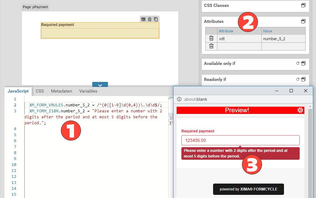 Zudem ist es auch möglich, in den Objekten XM_FORM_VRULES und XM_FORM_I18N eigene Einträge einzufügen. Um diesen Validator an einem Textfeld zu verwenden, muss dem Textfeld der entsprechende Wert für das HTML-Attribut vdt gegeben werden.