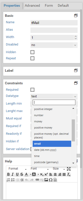 | Regular expression | - | Erlaubt die Verwendung einer eigenen RexExp zur Validierung. Ist dieser Datentyp ausgewählt, kann die zu nutzende RegExp und eine Fehlernachricht eingegeben werden. Zudem kann die Fehlernachricht auch in andere Sprachen übersetzt werden. Die RegExp wird als JavaScript RegExp ausgewerted, diese sind näher beschrieben unter mozilla.org. |
