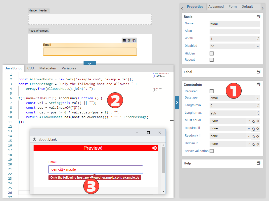 Für komplexe Anwendungsfälle kann es notwendig sein, eigene JavaScript-Logik zur Validierung zu schreiben. Hierzu steht die Funktion errorFunc zur Verfügung.
