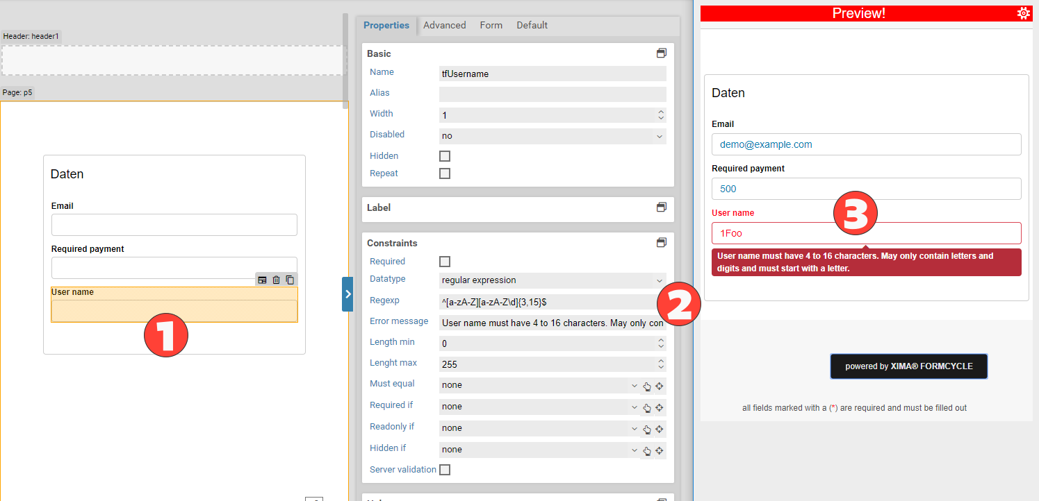 Textfelder können beliebigen frei eingebbaren Text enthalten. Oft sind aber nur bestimmte Werte erlaubt, etwa wenn eine E-Mail-Adresse oder Telefonnummer eingegeben werden muss. Um den Nutzer beim Ausfüllen des Formulars zu unterstützen und ihn früzeitig auf fehlerhafte Eingaben aufmerksam zu machen, können Validatoren an Textfelder gehangen werden.