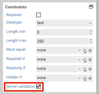 Die serverseitige Validierung ist nur möglich für die Eigenschaften, welche über die grafische Oberfläche konfigurierbar sind. Falls eigene Logik oder Validaten über JavaScript erstellt wurden, können, wird dies bei der serverseitigen Validierung nicht berücksichtigt. Wenn speziell Validatoren (wie weiter unten erläutert) überschrieben werden, darf die serverseitige Validierung nicht aktiviert werden.