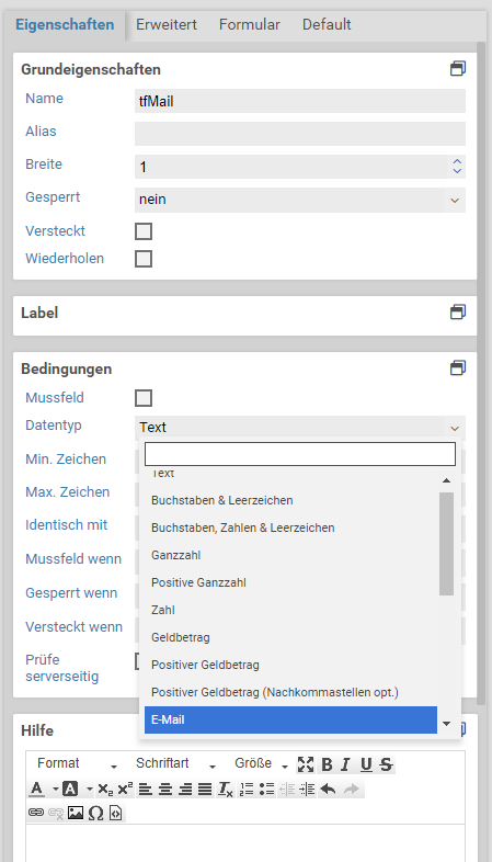 | Text | - | Standardeinstellung. Die Eingabe wird nicht validiert. Alle Zeichen sind erlaubt. |
