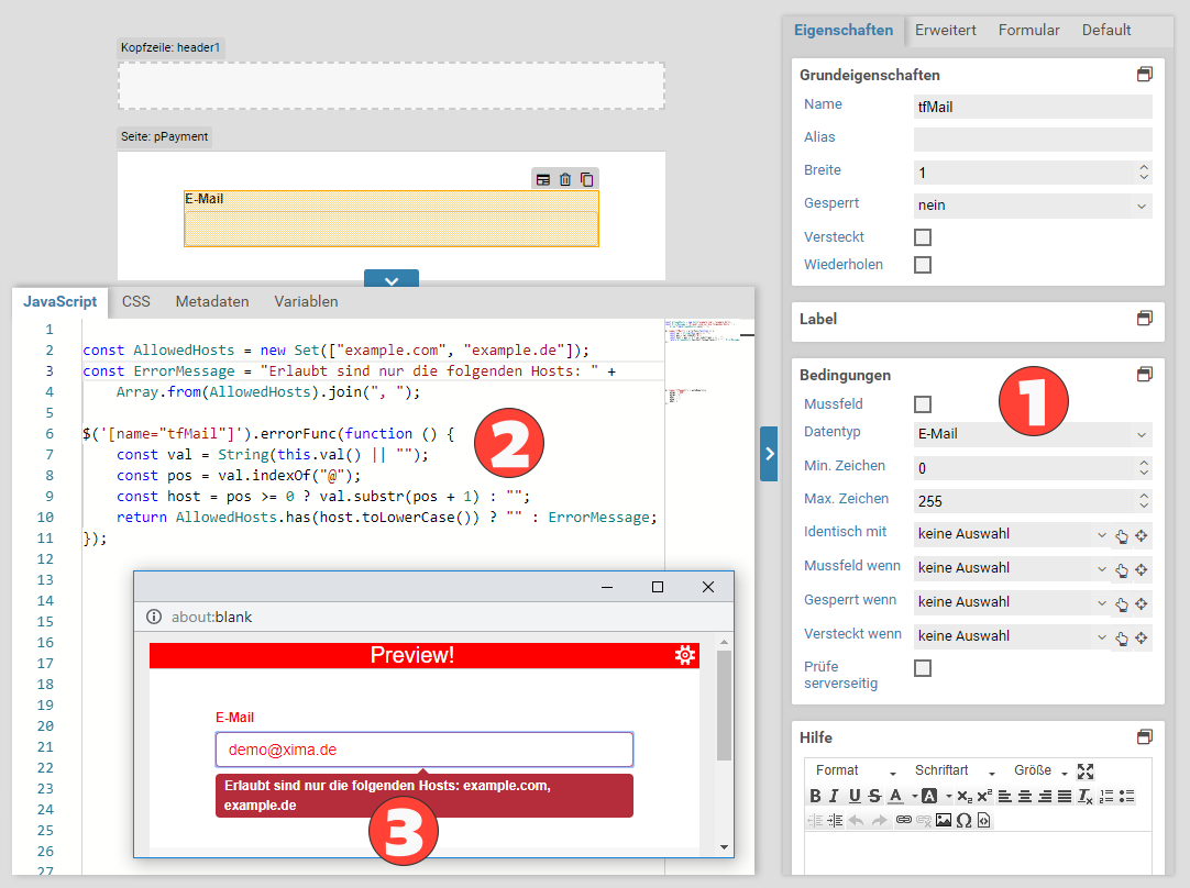 Für komplexe Anwendungsfälle kann es notwendig sein, eigene JavaScript-Logik zur Validierung zu schreiben. Hierzu steht die Funktion errorFunc zur Verfügung.