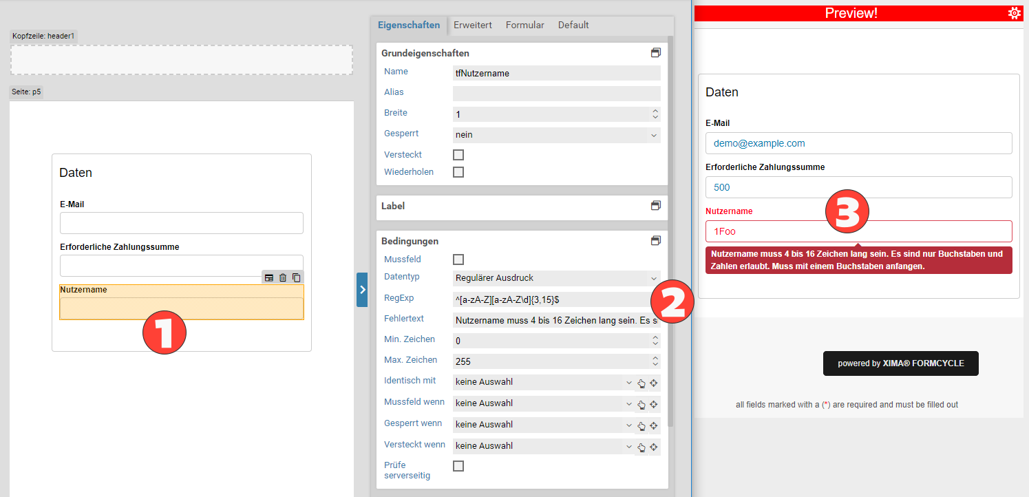 Für viele oft verwendete Datentypen stehen bereits fertige Validator in Xima® Formcycle zur Verfügung. Diese werden rechts im Eigenschaftsbereich unter Bedingungen eingestellt.