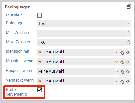 Standardmäßig werden die Daten nur clientseitig im Browser des Nutzers mittels JavaScript validiert. Dies bedeutet, dass jemand mit nötigen technischen Fachkenntnissen etwa ein Formular absenden kann, was eine ungültige E-Mail-Adresse enthält. Wenn es erforderlich ist, sicherzustellen, dass Nutzer keine ungültigen Daten einreichen können, kann die serverseitige Validierung aktiviert werden. Nach dem Absenden werden dann die Daten auf dem Server geprüft. Sind diese ungültig, wird der Formulareingang abgelehnt und der Nutzer erhält eine entsprechende Fehlermeldung. Für jedes Formularelement kann separat festgelegt werden, ob es serverseitig validiert werden soll.