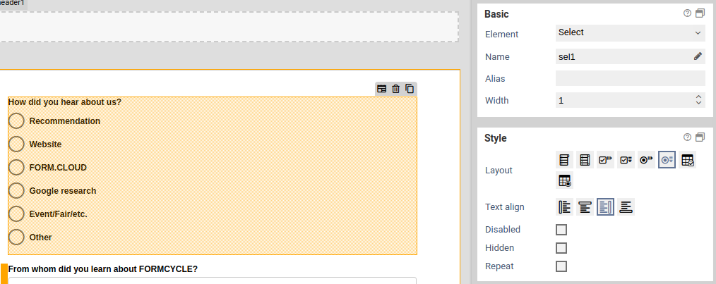 To select an element, click on it with the mouse. The element gets highlighted in orange. You can now edit the properties of the selected element in the properties panel to the right.
