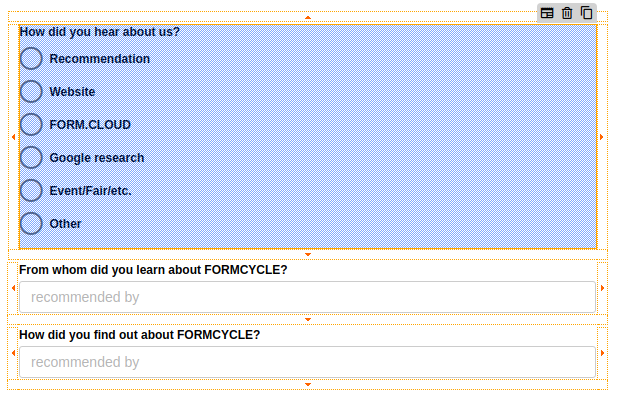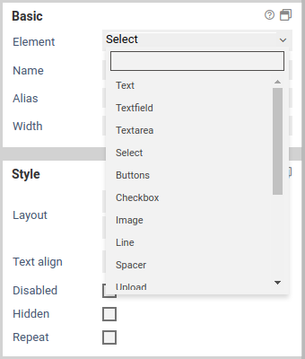 It is possible to transform existing elements in the form into other element types. While containers and fieldsets can only be transformed into the respective other element type, all other element types can be transformed into any other type, but not into containers and fieldsets.