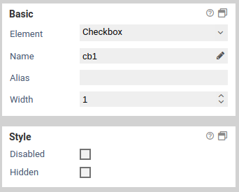 Form elements of type checkbox add a checkbox to the current form. The properties panel label allows you to add a descriptive label to the checkbox.
