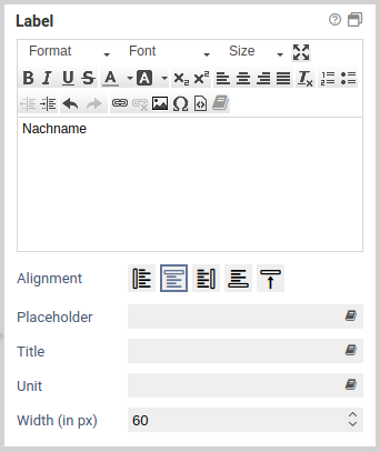 | Width | The width of the form element, relative to other elements in the same row. For example, when you place three elements next to each other in the same row and set their widths to 10, 10 und 30, they will take up 20% (=10/(10+10+30)), 20%, and 60% of the entire width of the row, respectively. |