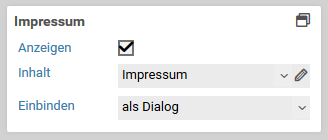 | Einbinden | Das Impressum kann als Dialog, als neues Fenster oder inline eingebunden werden. Wird die Option als Dialog oder als neues Fenster gewählt, dann erscheint in der Fußzeile ein Link, welcher das gewählte HTML-Template in einem Dialog bzw. neuen Browserfenster öffnet. Soll der Inhalt des HTML-Templates direkt am Ende der Fußzeile eingebunden werden, dann ist die Option inline zu wählen. |