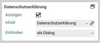 | Einbinden | Die Datenschutzerklärung kann als Dialog, als neues Fenster oder inline eingebunden werden. Wird die Option als Dialog oder als neues Fenster gewählt, dann erscheint in der Fußzeile ein Link, welcher das gewählte HTML-Template in einem Dialog bzw. neuen Browserfenster öffnet. Soll der Inhalt des HTML-Templates direkt am Ende der Fußzeile eingebunden werden, dann ist die Option inline zu wählen. |