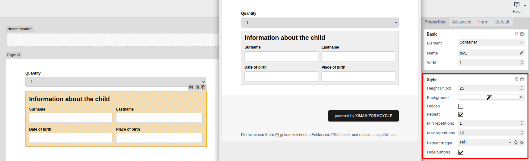 | Repeat trigger | When an element is selected here: The number of repeated elements is automatically set to the value of the selected element. For example: Assume there is a select element or input element that lets the user enter number of children in their household. Also assume there is a fieldset for entering some data of these children. The fieldset is marked as repeated, and the select or input element is set as the repetition trigger. Now when the user enters how many children they have got, fieldsets are removed or created automatically so that there is always one fieldset for each child. |