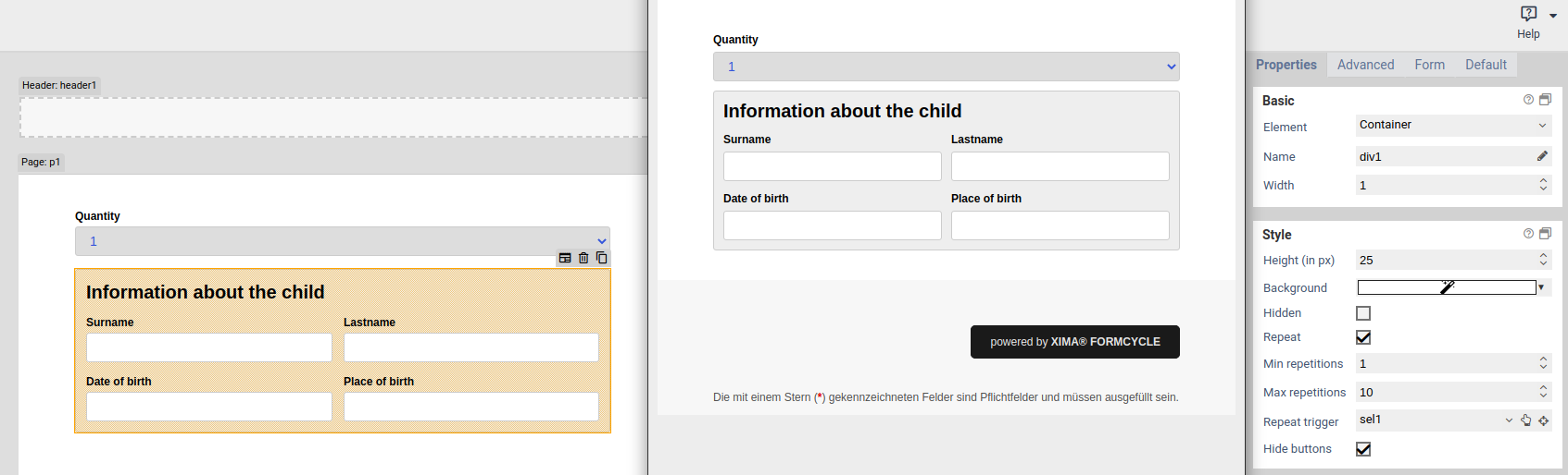 | Repeat trigger | When an element is selected here: The number of repeated elements is automatically set to the value of the selected element. For example: Assume there is a select element or input element that lets the user enter number of children in their household. Also assume there is a fieldset for entering some data of these children. The fieldset is marked as repeated, and the select or input element is set as the repetition trigger. Now when the user enters how many children they have got, fieldsets are removed or created automatically so that there is always one fieldset for each child. |