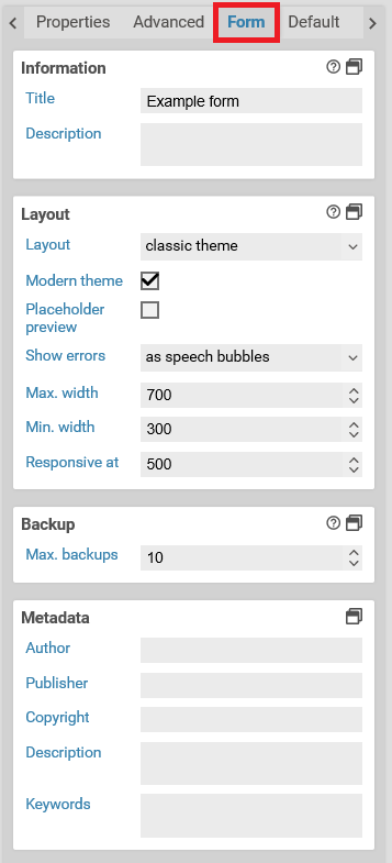 | Max. backups | Maximale number of form backups. Each time you save the form, a new backup is created. |