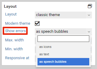 | Show errors | Specifies how errors are displayed. To change the default error messages, edit the global template i18n variables gehalten. |