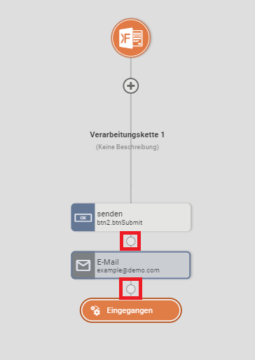 Aktionen führen Funktionen aus, wie etwa E-Mail senden oder das Befüllen einer PDF-Datei, und werden nach auslösen eines Ereignisses ausgeführt. Durch Drag & Drop einer Aktion oder dem Klick auf den Knotenpunkt, kann eine Aktion zu einem Ereignis und damit zu einer Verarbeitungskette hinzugefügt werden.