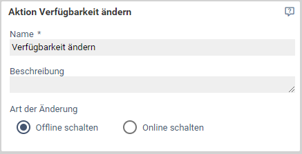 Aktionen vom Typ Verfügbarkeit ändern ermöglicht es, das Formular Online bzw. Offline zu schalten. Ist ein Formular nicht verfügbar, kann es weder aufgerufen noch abgesendet werden.