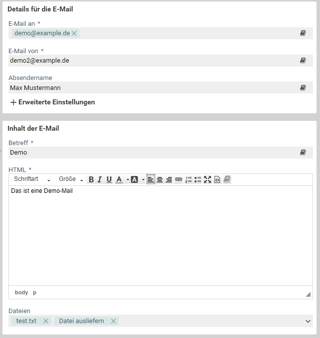 - Inhalt der E-Mail. Die Verwendung von Platzhaltern ist möglich.