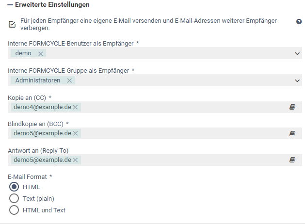 - E-Mail-Adressen, an welche eine Kopie versendet werden soll. Die Verwendung von Platzhaltern ist möglich.