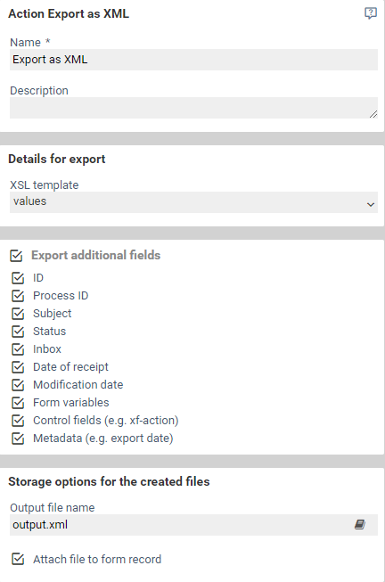 Actions of type Export as XML allow to provide the data of an form record as XML. Optionally, a XSL-Template provides the possibility to transform the data into another format.