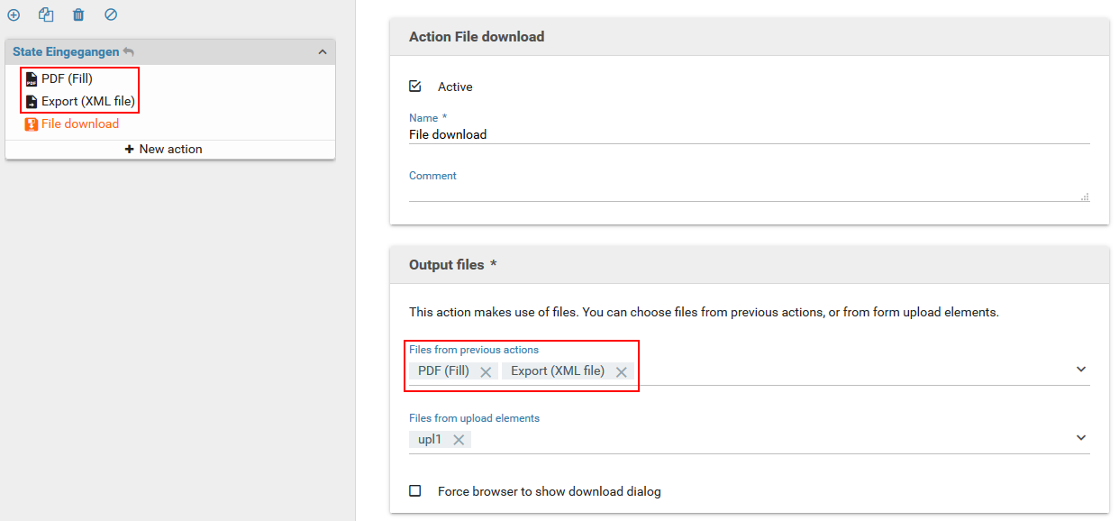 Actions of type Deliver file allows to deliver files directly to the browser (download), which were created during processing. If multiple files are selected, a ZIP file containing the individual files is automatically created. Please note that this action does not work if the workflow was triggered, for example, by a timed event, because in this case there is no browser to which the file could be sent.