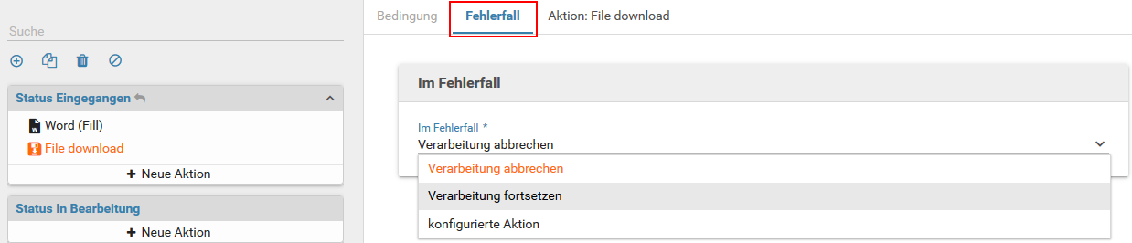 In jeder Aktion gibt es die Auswahlmöglichkeit für den Fehlerfall: