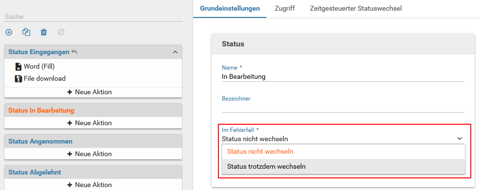 Jeder Status hat eine Konfigurationsmöglichkeit für die Behandlung bei Fehlern innerhalb der Abarbeitung. Es kann vorkommen, dass eine Aktion nicht ausgeführt werden kann, wenn z.B. Daten in eine Datenbank geschrieben werden soll und die Verbindung zur Datenbank zu diesem Zeitpunkt nicht besteht. In diesen Fällen muss entschieden werden, ob ein Statuswechsel vorgenommen oder der aktuelle Status beibehalten wird.