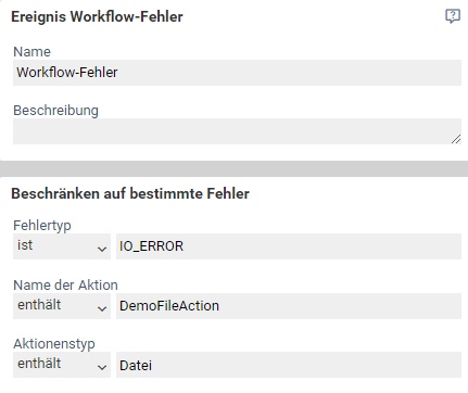 Beschränkung auf einen Fehlertyp. Dabei kann gefiltert werden, ob die Eingabe des Fehlertyps vorkommt oder es sich direkt um den Fehlertypen handelt. Bei keiner Eingabe werden alle Fehlertypen im Workflow das Ereignis auslösen, insofern keine weiteren Einschränkungen konfiguriert sind.