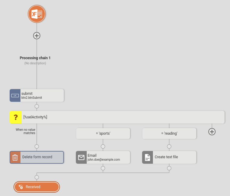 Mit Steuerelementen vom Typ Fallunterscheidung kann der Ablauf der Verarbeitung in Abhängigkeit von Formularwerten und andere Inhalten durch die Verwendung von Platzhaltern beeinflusst werden. Diese Elemente erlauben es, den Workflow in mehrere Pfade aufzuteilen, je nachdem, ob ein konfigurierter Wert bestimmten Vergleichswerten entspricht.
