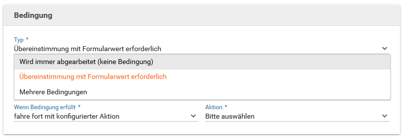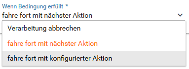 In jeder Aktion kann optional eine Abarbeitungsbedingung definiert werden, über die festgelegt wird, ob die Aktion aufgeführt wird oder nicht. Wird eine Bedingung festgelegt, so kann zusätzlich noch ausgewählt werden, wie weiterverfahren werden soll, wenn die Bedingung erfüllt ist.