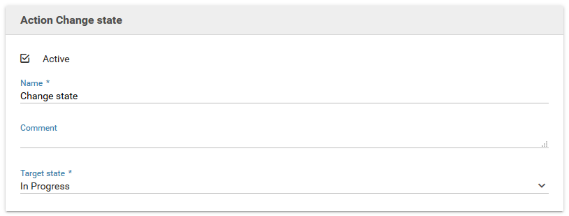 - Name of the target state: When this option is selected, a text field is displayed in which the name of the target state must be entered. This is especially intended for determining the target state via variable. If the determined state does not exist, the action will fail. If the determined state is exactly the state the form record is already in, the workflow will proceed with the next action. The result of the action ([%$<action name>.SUCCESS%]) is false in that case.