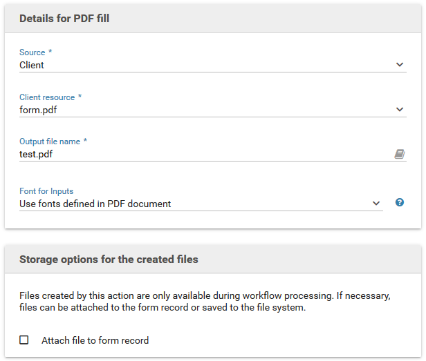- If this option is selected, files created in this action will be attached to the form record. Otherwise, they are only available for other actions within the workflow processing in the same state.