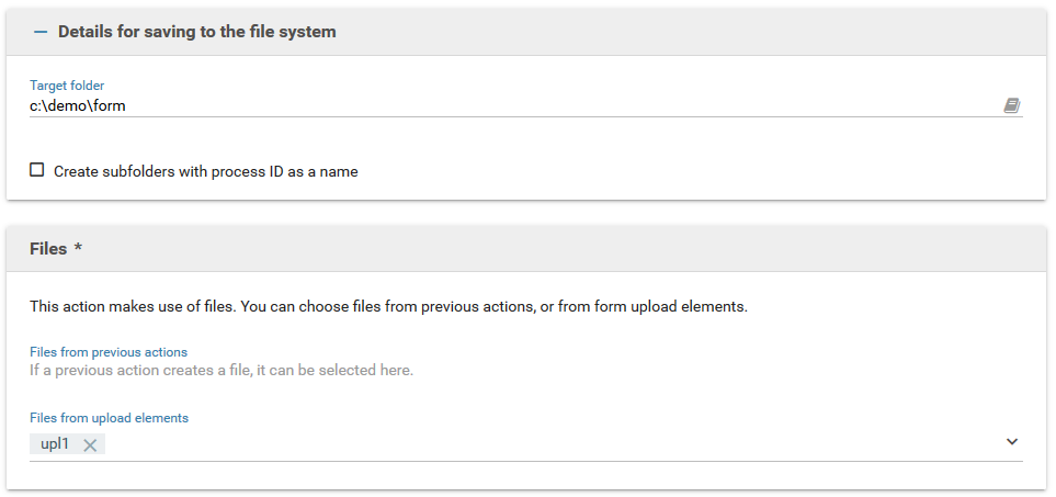 - When checked, a new subfolder will be created with the current process ID as its name, which can be used to separate files from different form records.