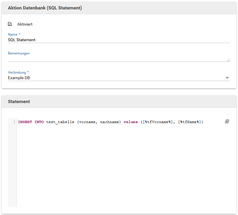 Aktionen vom Typ Datenbank (SQL Statement) ermöglichen es, ein SQL-Statement an eine vorher in der Datenbankverwaltung angelegten Verbindung zu senden. Innerhalb des Statements können Platzhalter (siehe Verwenden von Platzhaltern) verwendet werden. Die Verwendung von Platzhaltern ist möglich.