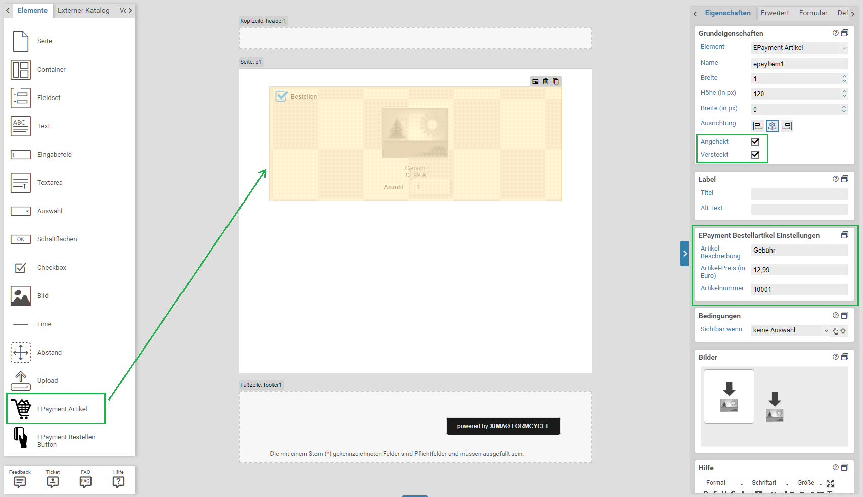 1.1. Artikel definieren durch das Formular-Element: EPayment Artikel:
