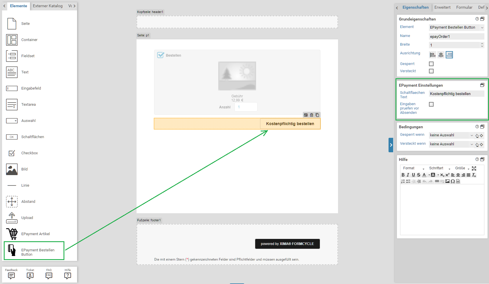 Über das Formular-Element EPayment Bestellen Button kann das Formular durch den Nutzer abgesendet und damit der Bezahlvorgang gestartet werden.
