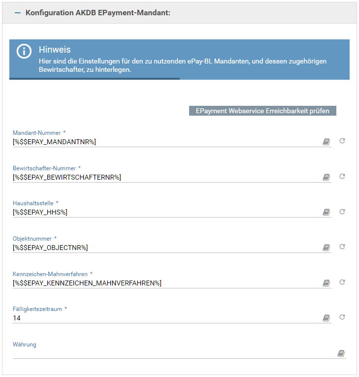 - AKDB-Mandantennummer des aufrufenden eShops (FORMCYCLE) (Wird durch ePay-BL-System vorgegeben)