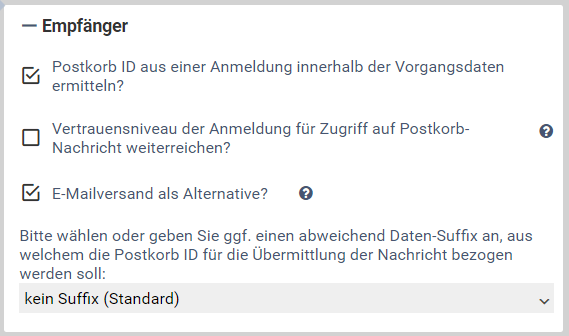 - Bitte wählen oder geben Sie ggf. einen abweichend Daten-Suffix an, aus welchem die Postkorb ID für die Übermittlung der Nachricht bezogen werden soll: