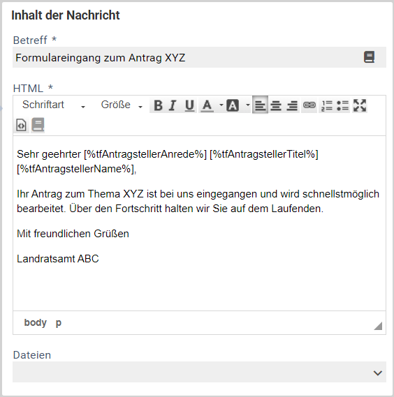 - Nachrichtentext. Es werden Platzhalter unterstützt.