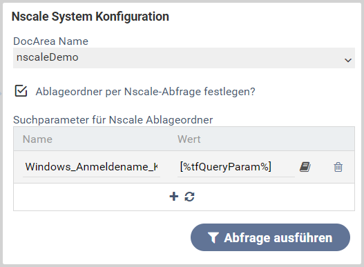Beispielkonfiguration zum Ermitteln eines Ablageordners aus dem Nscale-System zur Laufzeit. In den Abfrage-Werten können Platzhalter verwendet werden.