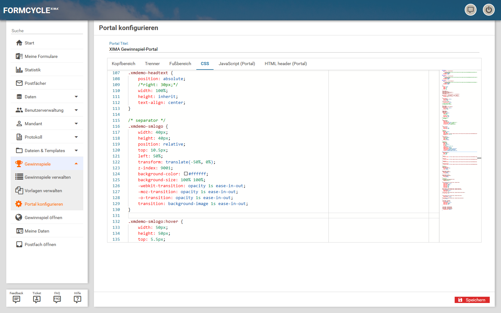 - Unter diesem Punkt können Stuktur, Aussehen und Verhalten des Gewinnspiel-Portals konfiguriert werden. Siehe Portal konfigurieren.